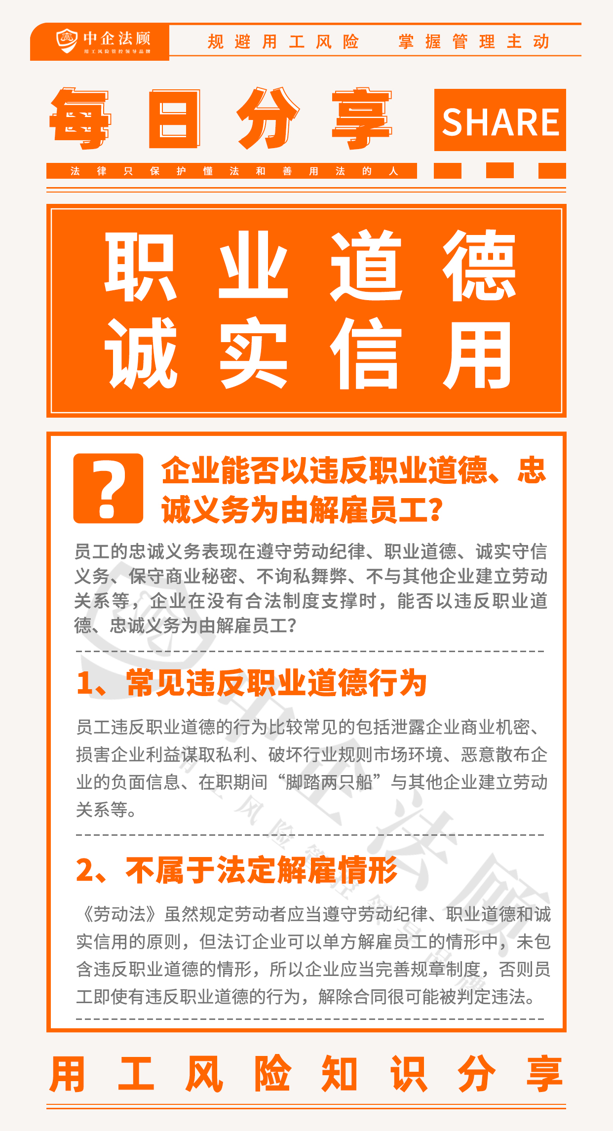 《劳动法》虽然规定劳动者应当遵守劳动纪律、职业道德和诚实信用的原则,但法订企业可以单方解雇员工的情形中,未包含违反职业道德的情形,所以企业应当完善规章制度,否则员工即使有违反职业道德的行为,解除合同很可能被判定违法。
