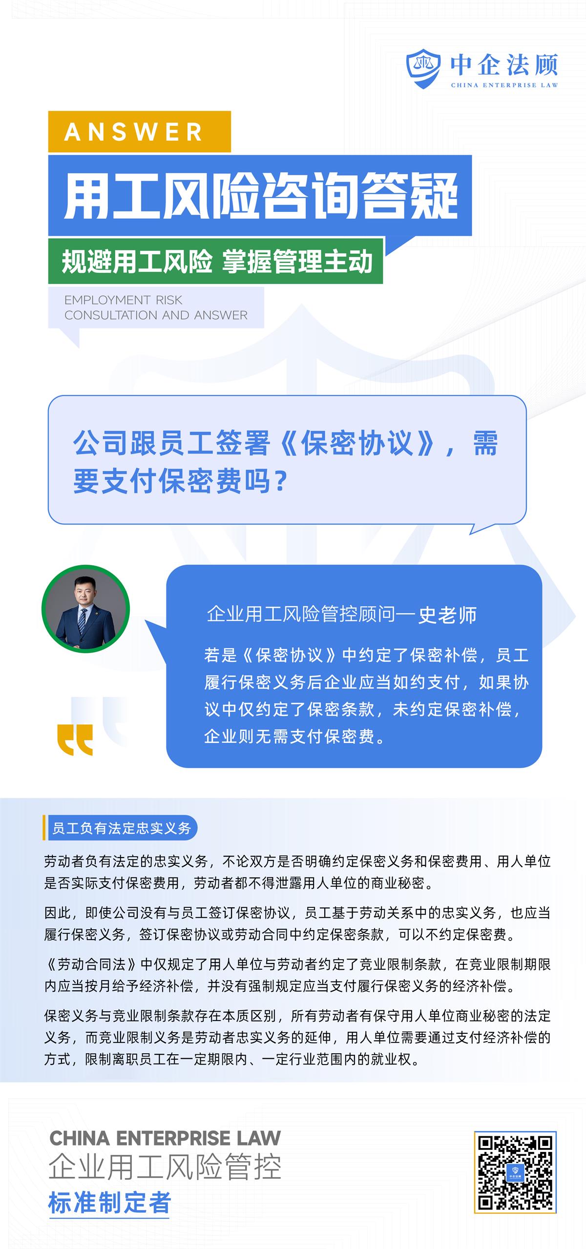公司跟员工签署《保密协议》,需要支付保密费吗?